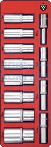 Торцевые шестигранные глубокие головки 1/2" размером 10, 12, 13, 14, 17, 18, 19, 21, 22, 24, 27, 30 мм;Ложемент.