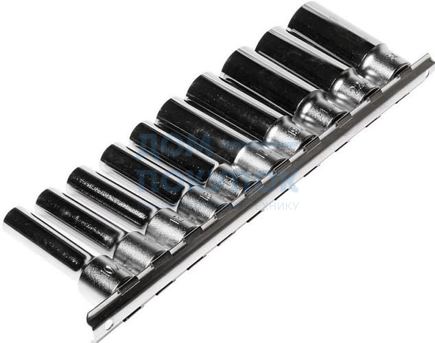 10 шестигранных головок 1/2" длиной 76 мм: 10, 11, 12, 13, 14, 17, 19, 21, 22, 24 мм;Планка крепления головок;Упаковка 375х115х40 мм.