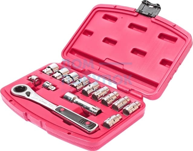 10 головок: 10, 11, 12, 13, 14, 15, 16, 17, 18, 19 мм;2 адаптера под ключ 3/8", 1/4Dr;1 удлинитель;1 трещотка с реверсивным механизмом 72 зуба;Прочный пластиковый кейс.