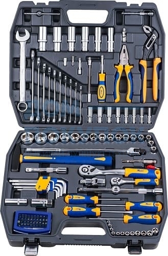 Головки торцевые ¼''Dr. 6 граней (12 шт.): 4,4.5,5,5.5,6,7,8,9,10,11,12,13mm;Головки торцевые ¼''Dr. глубокие 6 граней (8 шт.):6,7,8,9,10,11,12,13mm;Удлинитель ¼''Dr. (2 шт.): 2'', 4'';Удлинитель гибкий ¼''Dr. 5" (125мм);Кардан шарнирный ¼''Dr.;Рукоятка трещоточная с быстрым сбросом ¼''Dr. (72Т);Вороток Т-образный ¼''Dr. (125мм);Рукоятка удлинитель ¼''Dr.;Переходник ¼''Dr. шестигранник (под электроинструмент);Держатель вставок ¼''Dr. с магнитом (25мм);Держатель вставок ¼''Dr. с магнитом (60мм) под электроинструмент;Универсальный модуль с битами-вставками (32 шт.):Torx (8 шт.) T8,T10,T15,T20,T25,T27,T30,T40;Hex (7 шт.)1,5, H2,H2.5,H3,H4,H5,H6;Шлицевые (7 шт.): Sl3,Sl4, Sl4.5, Sl5,Sl5.5,Sl6,Sl7;Крестовые (10 шт.): Ph0,Ph1,Ph2, Ph3, Ph4,Pz0,Pz1,Pz2,Pz3,Pz4;Головки торцевые ½''Dr. 6 граней (12 шт.): 14,15,16,17,18,19,20,22,24,27,30,32 mm;Головки торцевые ½''Dr. глубокие 6 граней (6 шт.): 14,15,17,19,21,22;Головки торцевые глубокие ½''Dr. свечные (2 шт.): 16,21 mm;Кардан шарнирный ½''Dr.;Удлинитель ½''Dr. (2 шт.): 5'', 10'';Рукоятка трещоточная с быстрым сбросом ½''Dr. (72Т);Вороток шарнирный ½''Dr. 375mm;Адаптер ½''Dr. (M) ?''Dr. (F) под удлинитель ½''Dr.;Головки торцевые ½''Dr. E профиль (4 шт.): E10,E12,E14,E16;Ключи гаечные комбинированные (11 шт.):8,9,10,11,12,13,14,15,17,19,22;Пассатижи комбинированные 180 мм;Клещи переставные;Молоток слесарный 300 гр;Отвертки шлицевые (2 шт.): 6,5*100, 8*150;Отвертки крестовые (2 шт.): Ph1*75, Ph2*100;Автомобильный тестер;Набор торцевых шестигранных Г-образных ключей (9 пр.);Головки торцевые ¼''Dr. глубокие 6 граней (8 шт.): 6,7,8,9,10,11,12,13mm;Кейс.