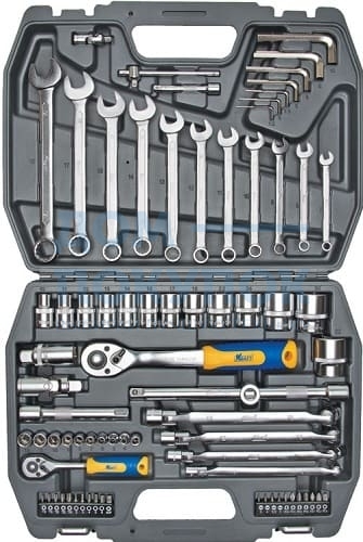 Торцевые головки ½'' 6 граней (13 шт.):10;11;12;13;14;15;17;19;22;24;27;30;32;Кардан шарнирный ½'';Торцевые головки свечные (1шт.):21;Удлинитель ½'' (2шт.):125,250mm;Рукоятка трещоточная с быстрым сбросом ½'' 250mm (72 зубца, двухкомпонентная);Переходник ?" (F) х ½'' (М);Торцевые головки ¼'' 6 граней (9шт.):4;5;6;7;8;9;10;11;12;Удлинитель ¼'' (1шт.):75mm;Переходник ¼'' Вороток Т-образный ¼'';Кардан шарнирный ¼'';Рукоятка трещоточная с быстрым сбросом ¼'' 145mm (72 зубца, двухкомпонентная);Биты-вставки 6,35*25mm: torx (5шт.):10;15;20;25;30;Биты-вставки 6,35*25mm: шлицевые (4шт.):3;4;5,5;7;Биты-вставки 6,35*25mm: Phillips (4шт.):0;1;2;3;Биты-вставки 6,35*25mm: шестигранные (5шт.):2;3;4;5;6;Биты-вставки 6,35*25mm: pozi (3 шт.):1;2;3;Держатель для бит-вставок ¼'';Ключи торцевые шарнирные (4шт.): 8*9,10*11,12*13,14*15;Ключи торцевые шестигранные Г-образные (7шт.):1,5;2;2,5;5;6;8;10;Ключи рожково-накидные (11шт.):7;8;9;10;11;12;13;14;15;17;19;Кейс.