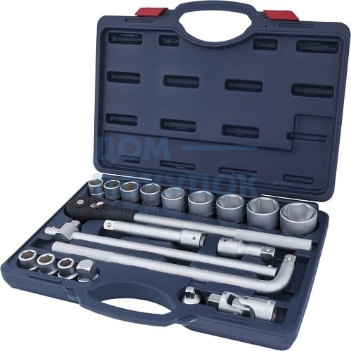 Торцевые головки на 3/4: 19 - 21 - 22 - 24 - 27 - 30 - 32 - 36 - 38 - 41 - 46 - 50 мм;Трещотка 3/4" на 500 мм;Удлинитель 3/4" на 100, 200 мм;Вороток Т-образный 3/4" на 450 мм;Вороток L-образный 3/4";Карданный шарнир 3/4";Адаптер 3/4"(F)*1/2"(M) & 3/4"(F)*1"(M);Пластиковый кейс.