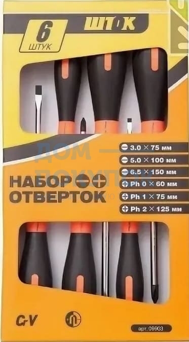 Шлицевые отвертки - 3 шт (3х75 мм, 5,0х100 мм, 6,5х150 мм);Крестовые отвертки - 3 шт (Ph0х60 мм, Ph1х75 мм, Ph2х125 мм);Картонная упаковка.