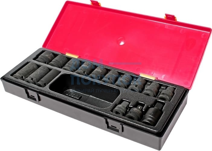 1/2" DR.6PT ударная головка: 10 мм, 12 мм, 13 мм, 14 мм, 15 мм, 17 мм, 19 мм, 21 мм, 22 мм, 24 мм - 10 шт.;1/2" DR.6PT ударные глубокие головки: 17 мм, 19 мм, 21 мм - 3 шт.ударный адаптер F3/8"хM1/2" - 1 шт.;ударный адаптер М1/2"хF3/8" - 1 шт. ;1/2 "DR ударный универсальный шарнир - 1 шт.