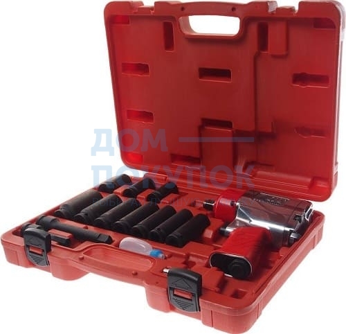 Гайковерт ударный пневматический - 1 шт.;Головка средней глубины 1/2"DR. 17, 19, 21 мм - 3 шт.;Головка глубокая с тонкими стенками 1/2"DR. 17, 19, 21 мм - 3 шт.;Головка глубокая ударная 1/2"DR. 22, 24, 27 мм - 3 шт.;Головка для колесных гаек 17мм - 1 шт.;Головка ударная hex 1/2"DR. H12x78L - 1 шт.;Удлинитель ударный 1/2"DR x 5" - 1 шт.;Смазка - 1 шт.;Воздушный штуцер - 1 шт.;Кейс.