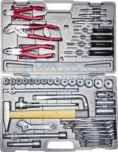 Головки торцевые, 15 шт: 8, 10, 11, 12, 13, 14, 15, 17, 19, 21, 22, 24, 27, 30, 32;Головки торцевые свечные, 2 шт: 16, 21;Трещотка;Удлинители, 2 шт: 125, 250 мм;Вороток Т-образный;Карданный шарнир;Вороток Г-образный с монтажной лопаткой;Плоскогубцы - 200 мм;Кусачки - 160 мм;Клещи переставные - 250 мм;Бородок - 2 мм;Кернер - 2 мм;Зубило плоское 16х160 мм;Отвертки: плоские, 2 шт: 0.6х4.0 мм, 1.0х6.5 мм, крестовые 4 шт: PH1, PH2;Ключ разводной - 150 мм;Размер под ключ до 19 мм;Ключи гаечные рожковые, 7 шт: 8х10, 10х12, 13х15, 14х17, 17х19, 19х22, 22х24 мм;Молоток - 400 г.