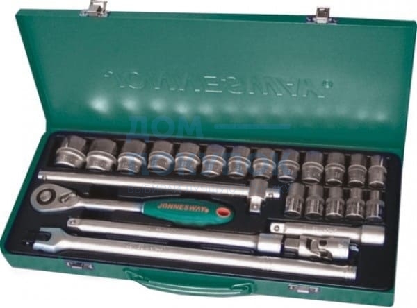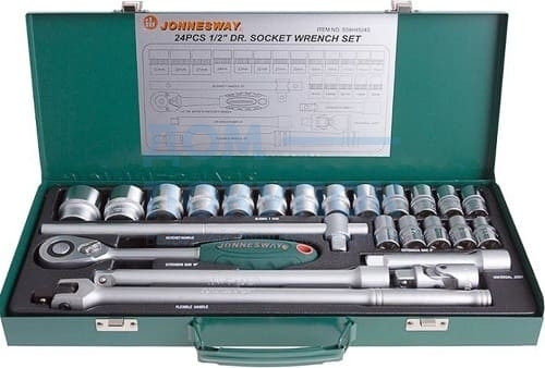 В набор входят 24 предмета, помещенных в металлический кейс:Трещотка 48 зубцев;Торцевые головки 1/2" DR 18 шт: 10мм, 11мм, 12мм, 13мм, 14мм, 15мм, 16мм, 17мм, 18мм, 19мм, 20мм, 21мм, 22мм, 23мм, 24мм, 27мм, 30мм, 32 мм;Удлинители 125 мм и 250 мм;Шарнирная рукоятка 375 мм;Вороток Т-образный;Кардан.