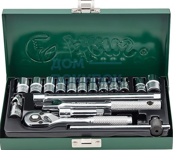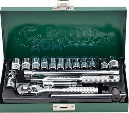 Головка торцевая шестигранная 4, 4.5, 5, 6, 7, 8, 9, 10, 11, 12 мм – 10 шт;Головка торцевая восьмигранная (8, 10 мм) – 2 шт;Ключ трещоточный реверсивный;Вороток шарнирный, длина 150 мм;Удлинитель, длина 50 мм;Удлинитель, длина 150 мм;Вороток т-образный, длина 115 мм;Шарнир карданный;Кейс.